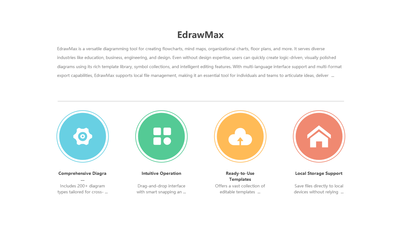Explore EdrawMax: a versatile tool for creating flowcharts, mind maps, organizational charts with intuitive operation, ready-to-use templates, and local storage support.