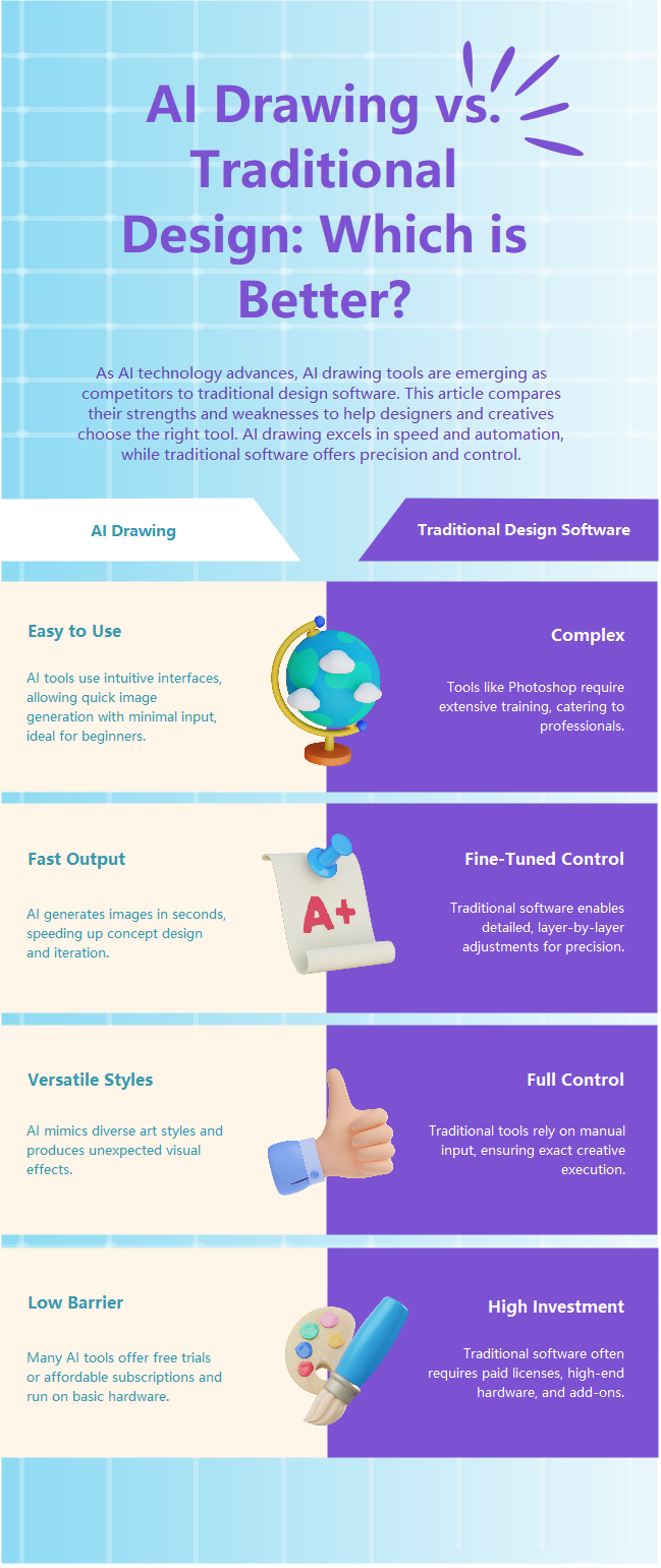 A comparison of AI drawing tools vs traditional design software, highlighting the strengths and weaknesses of each to help designers make the right choice.