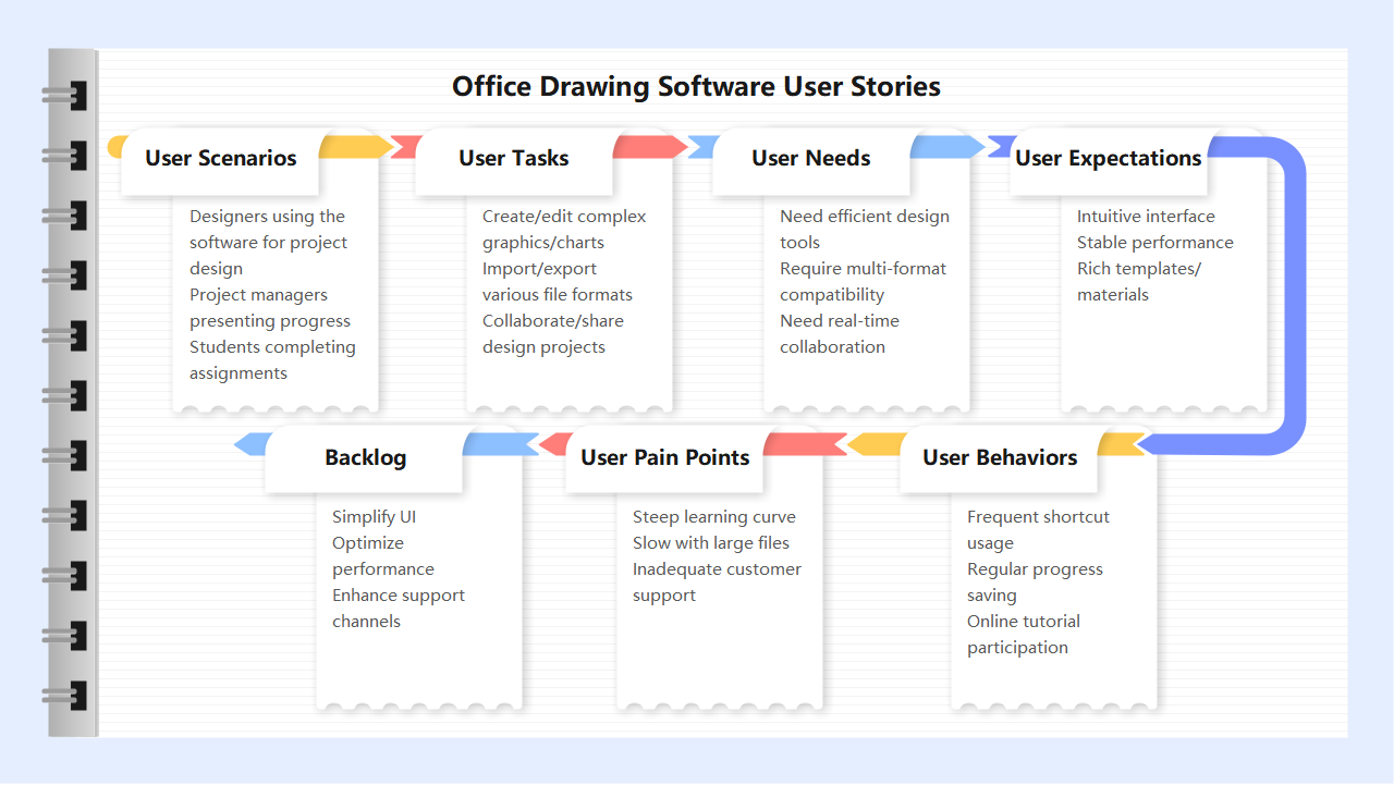 Diagram outlining user stories for office drawing software, covering scenarios, tasks, needs, expectations, pain points, backlog, and behaviors.