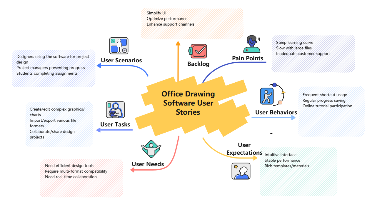 Diagram depicting user stories for office drawing software, highlighting key aspects such as user needs, scenarios, tasks, pain points, expectations, and behaviors.