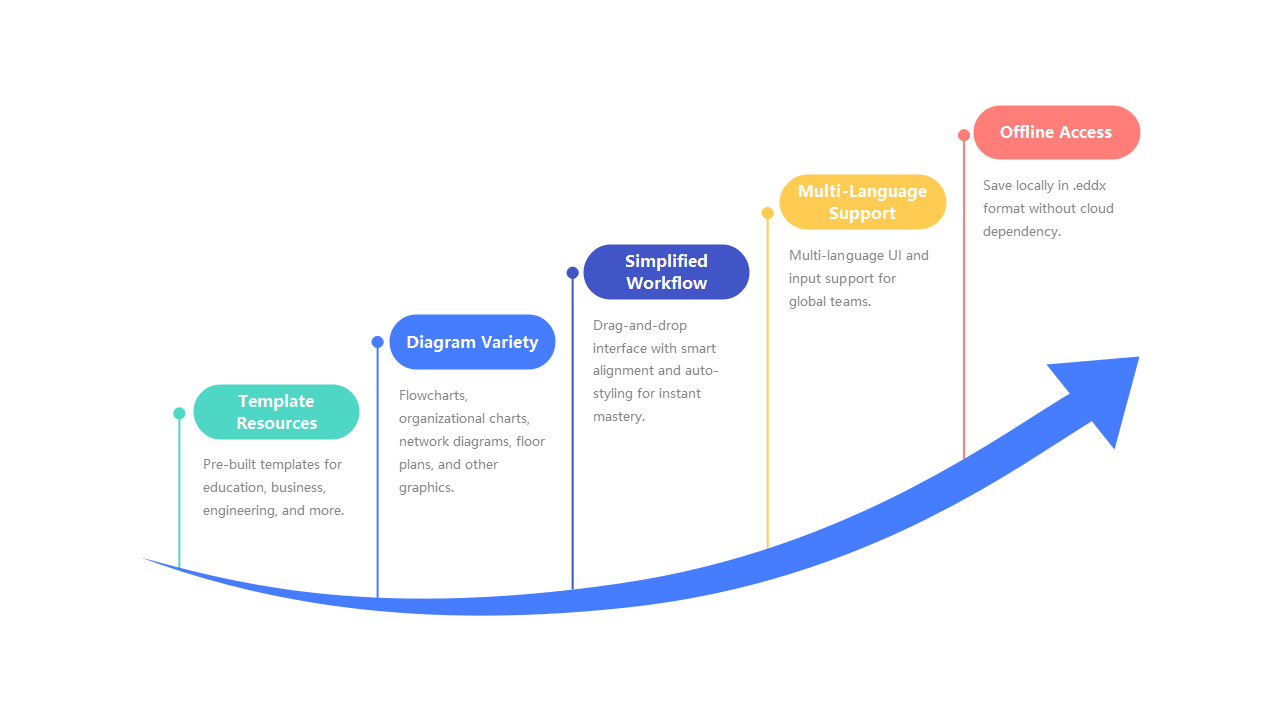 Diagram software features template resources, diagram variety, simplified workflow, multi-language support, and offline access.
