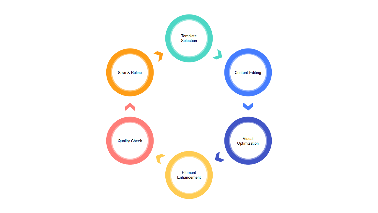 Diagram showing a circular workflow with Template Selection, Content Editing, Visual Optimization, Element Enhancement, Quality Check and Save & Refine.