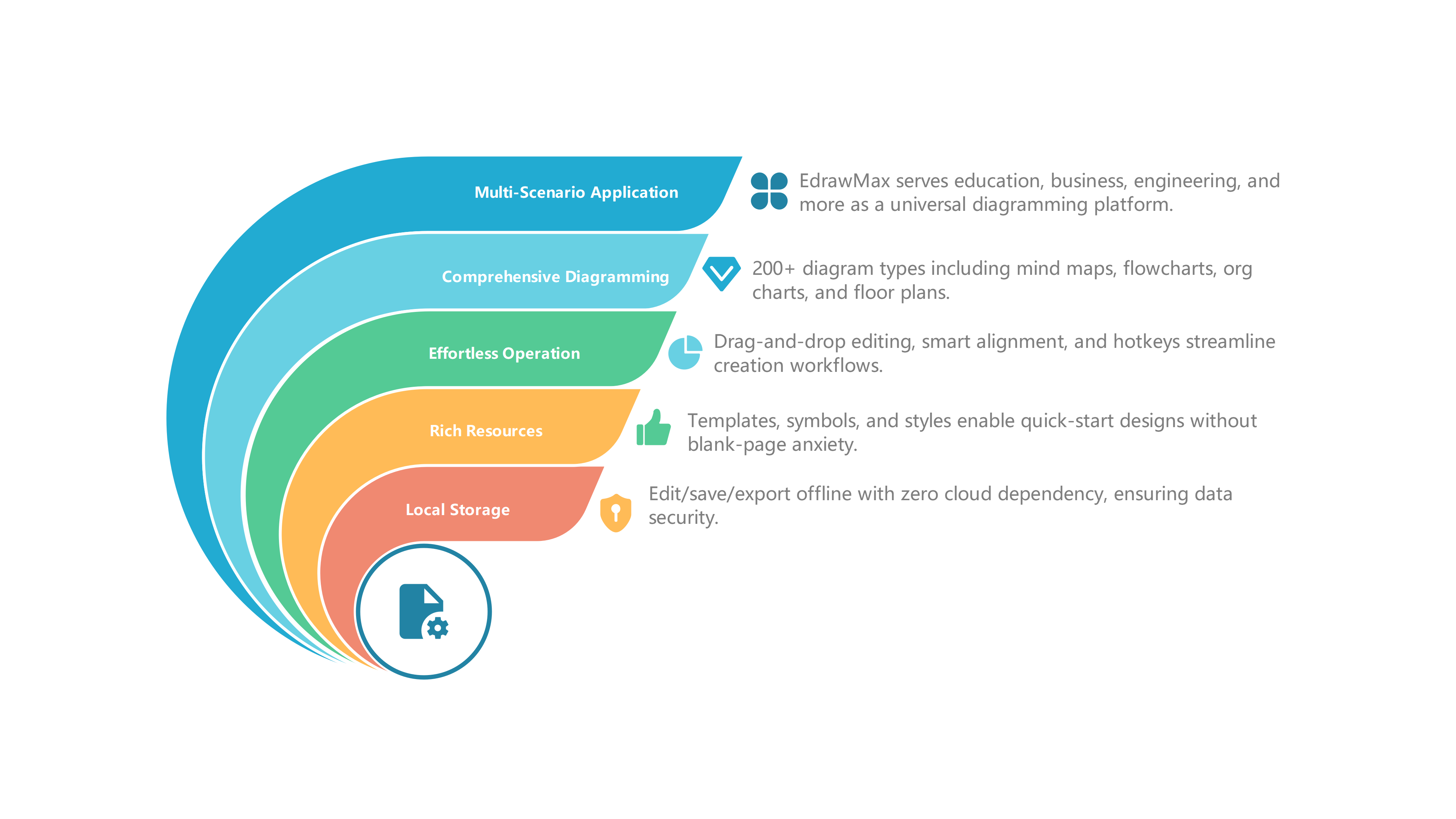 EdrawMax diagramming platform features multi-scenario applications, comprehensive diagramming, effortless operation, rich resources, and local storage.