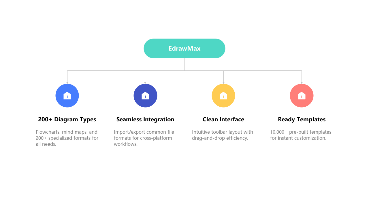 EdrawMax features flowcharts, mind maps, 200+ formats, import/export, intuitive drag-and-drop toolbar and 10,000+ pre-built templates for instant customization.