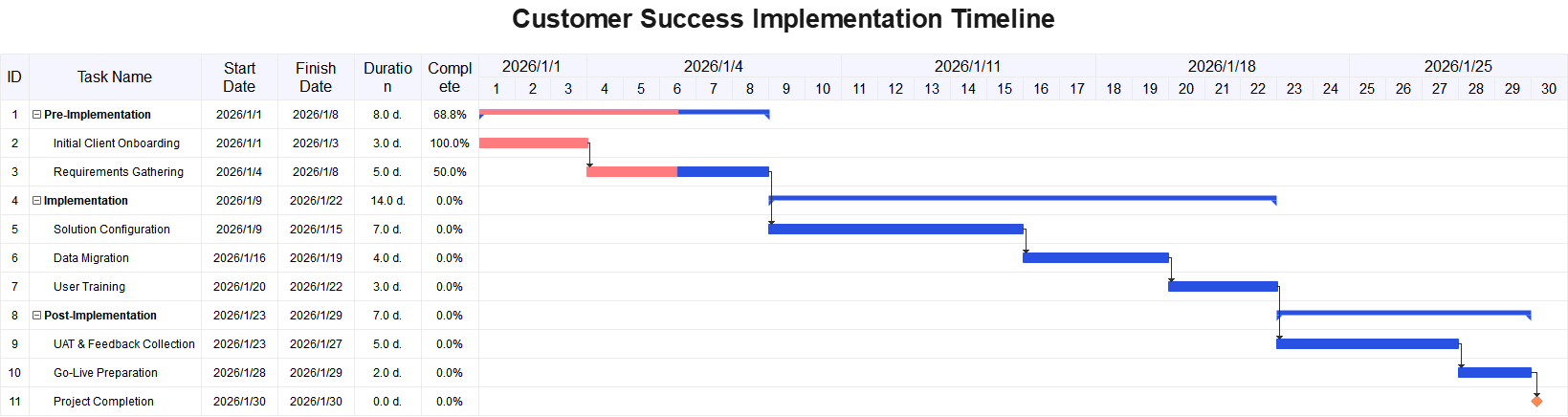 Customer Success Implementation Timeline displaying tasks, start/end dates, duration, and completion status. From pre-implementation to project completion.