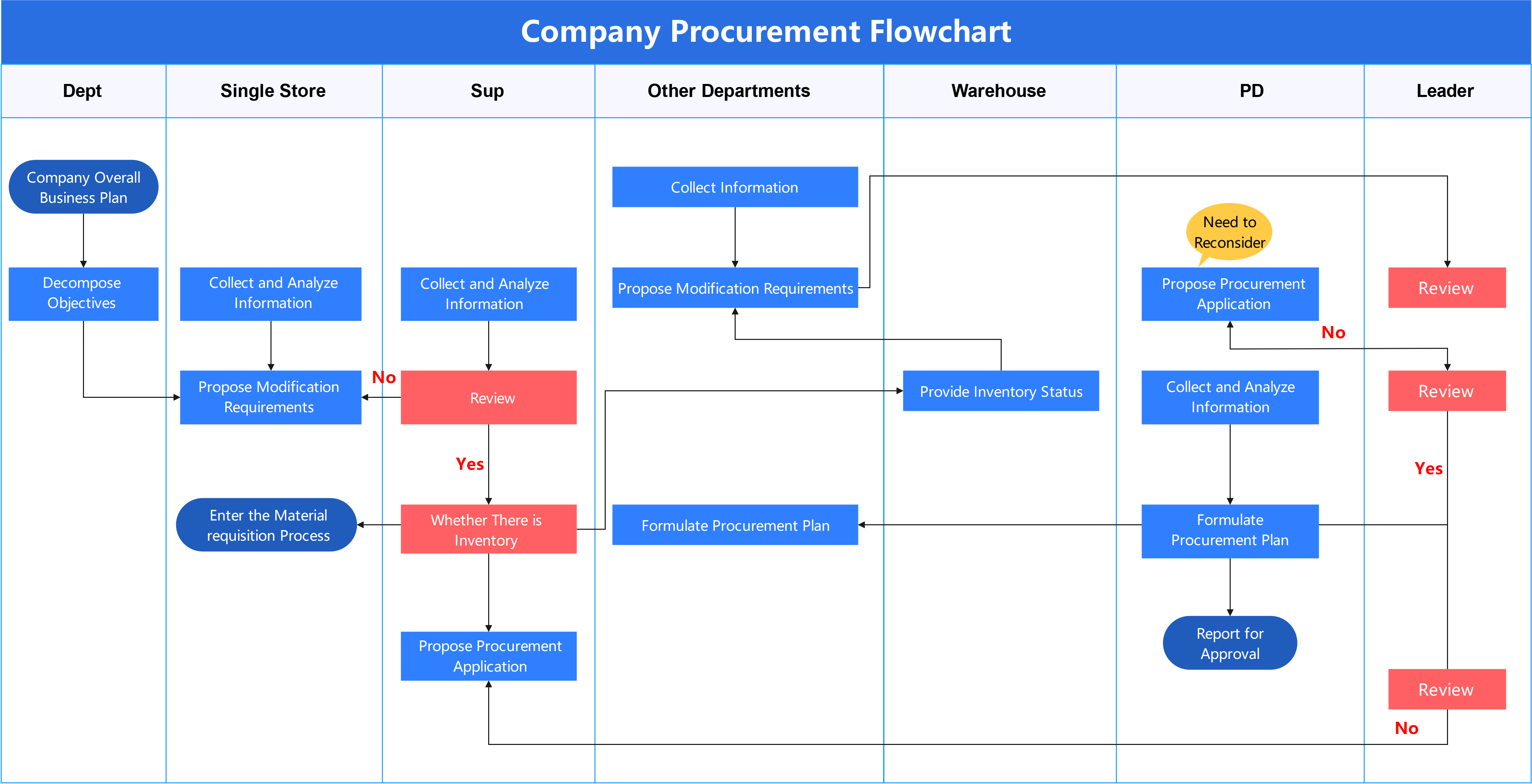 A visual flowchart detailing the company procurement process from initial planning to final review, covering steps across departments and ensuring inventory alignment.