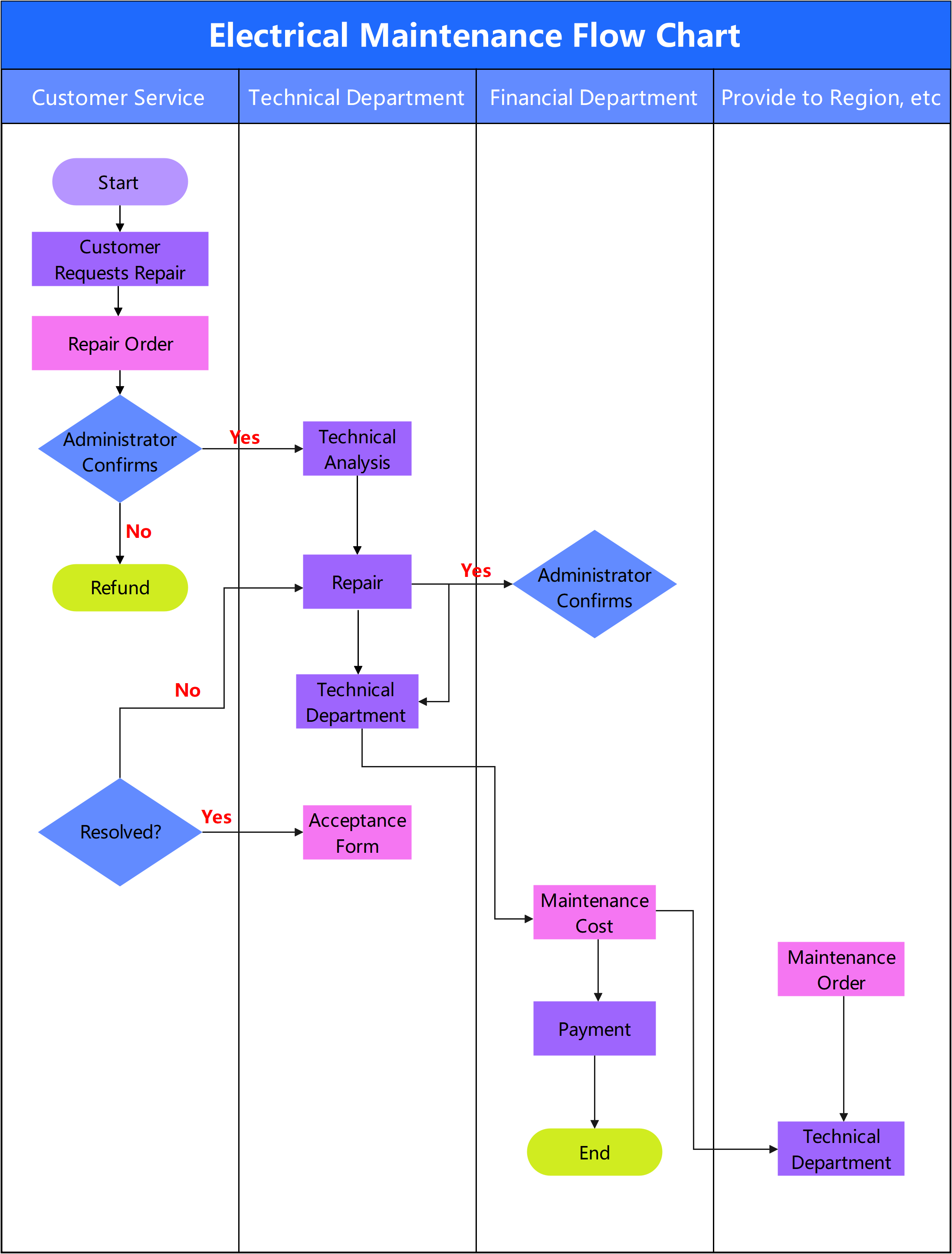 The electrical maintenance flow chart outlines processes from customer requests to technical analysis, repairs, and cost considerations.