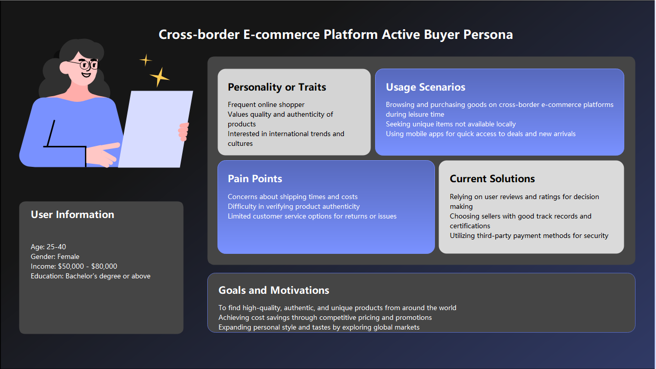 A detailed active buyer persona for cross-border e-commerce, including traits, scenarios, pain points, solutions and goals.