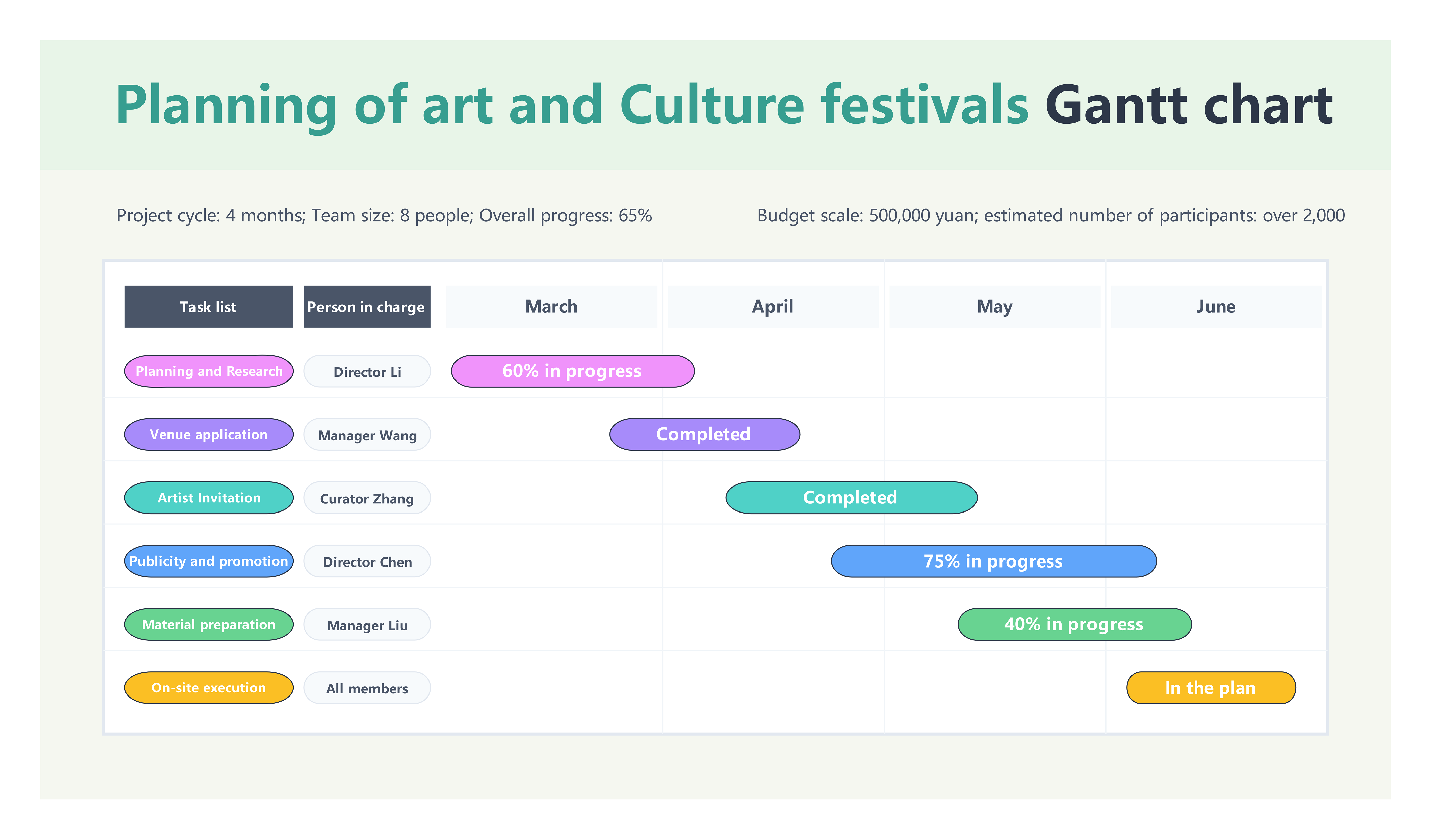 Gantt chart showing the timeline and progress of planning art and culture festivals, including tasks, personnel, and timelines.