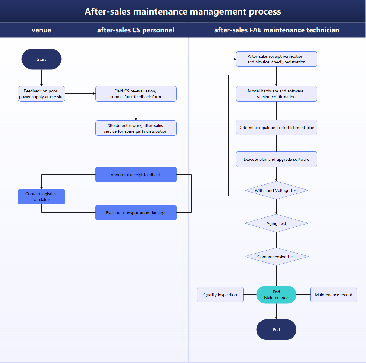 Visualizes the after-sales maintenance process, detailing steps from venue to the FAE maintenance technician. Includes feedback, evaluation, and hardware/software checks.