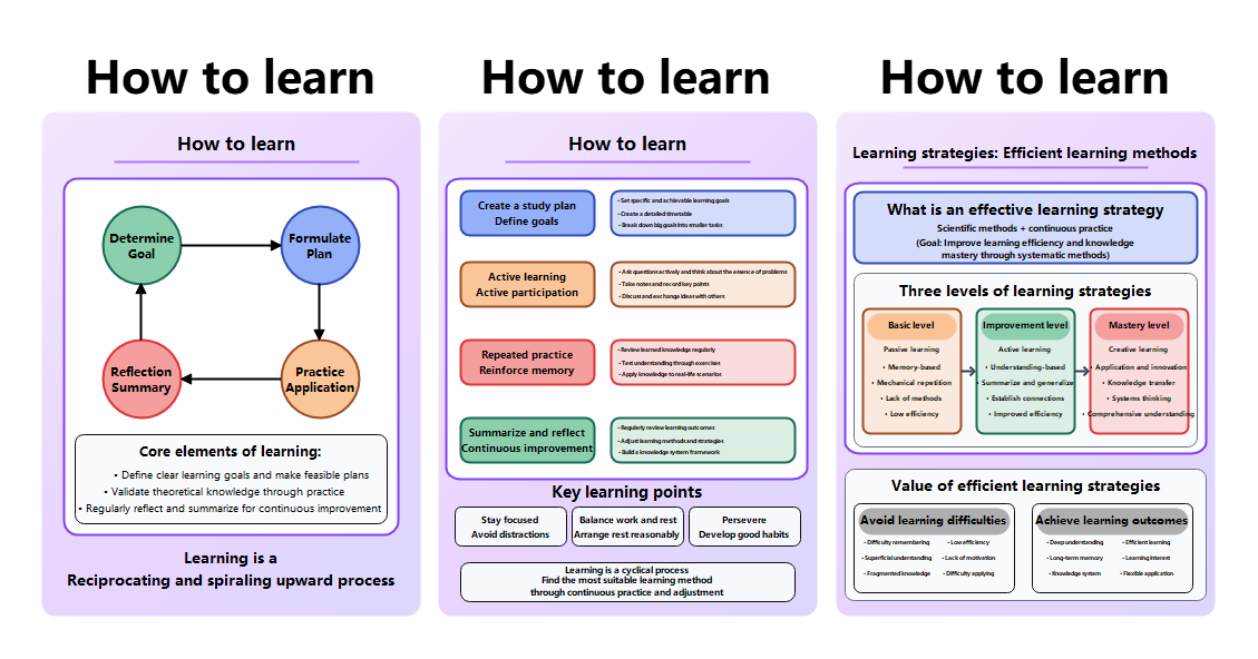 This visual guide outlines how to learn effectively, covering goal setting, active participation, practice, reflection, and efficient learning methods to achieve mastery.