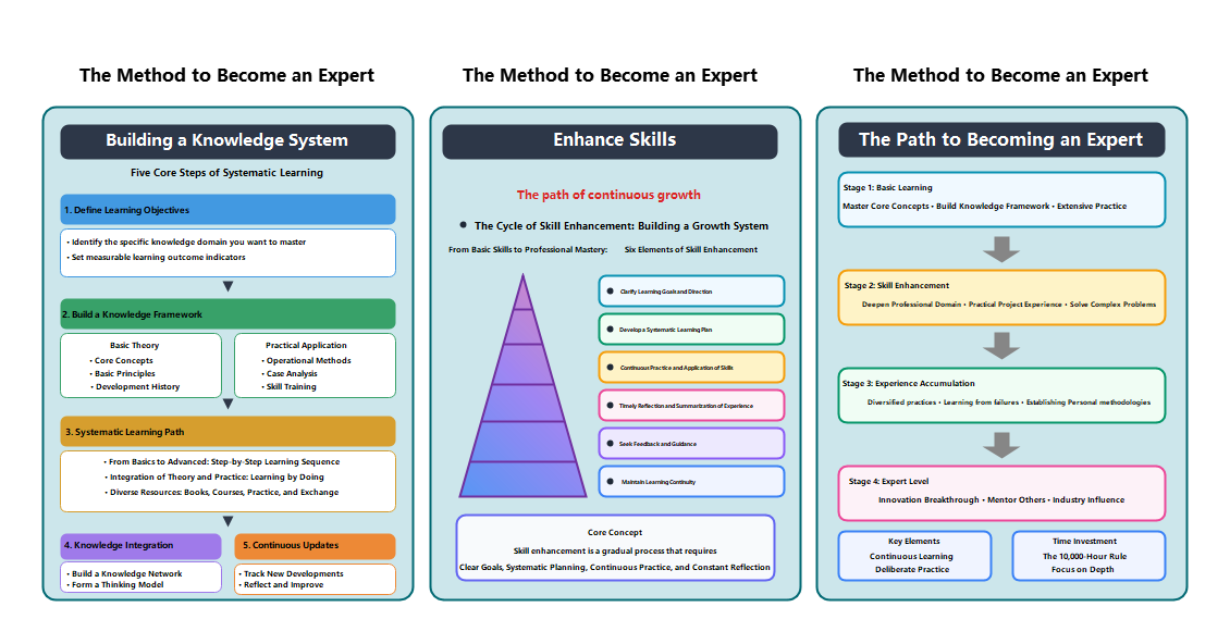 Diagram illustrating the systematic steps to building knowledge, enhancing skills, and becoming an expert. Includes the cycle of skill enhancement and key stages.