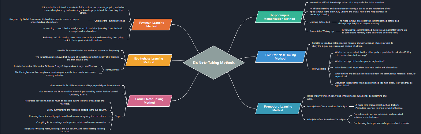 This mind map illustrates six different note-taking methods, including Feynman, Ebbinghaus, Cornell, Hippocampus, Five-Star, and Pomodoro learning methods.