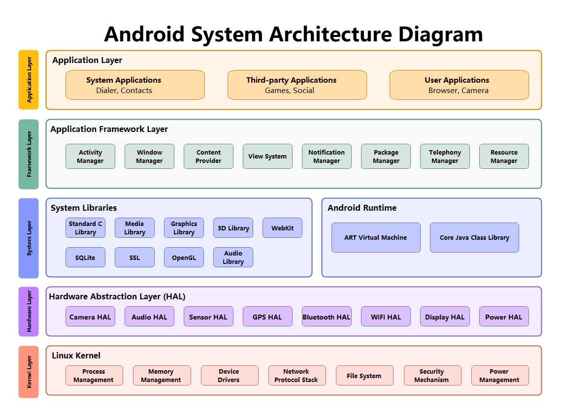 This diagram illustrates the Android software stack, showcasing layers from the Linux Kernel to Application Layer. It details key components like HAL, System Libraries and Runtime.