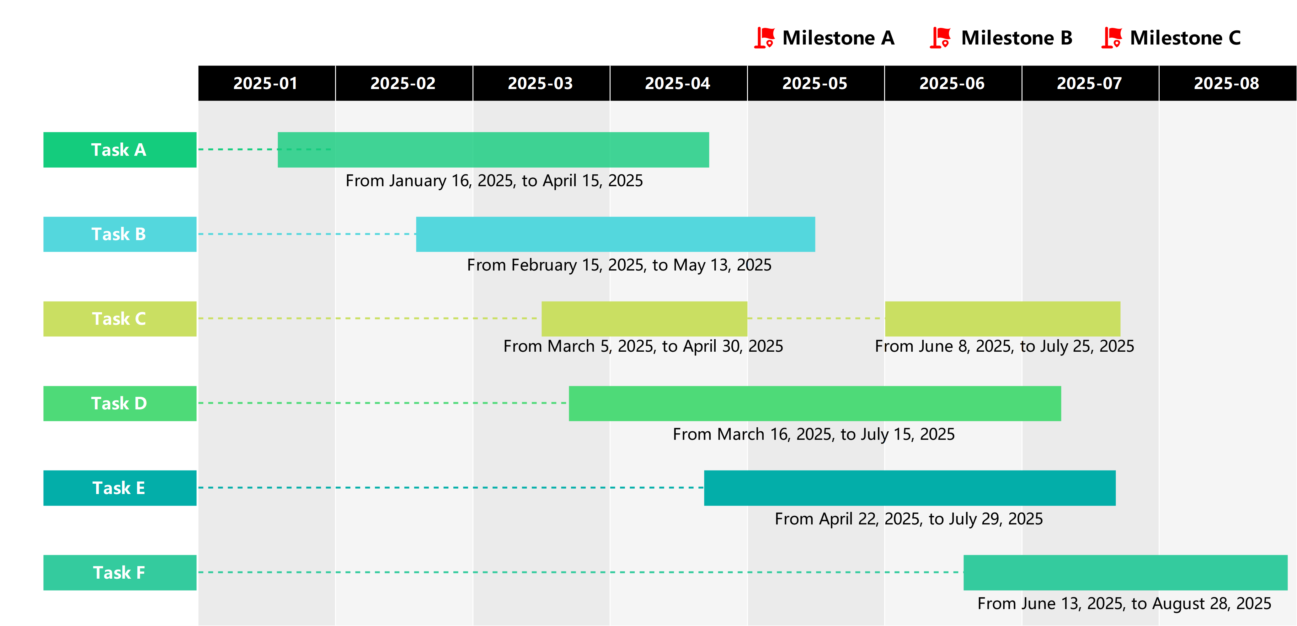 A timeline visualization showing the duration of tasks A to F across several months in 2025. Provides insight into project schedule.