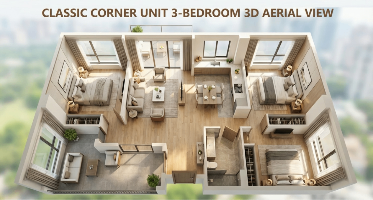 Discover a classic corner unit 3-bedroom apartment with a 3D aerial view, highlighting its spacious layout and modern design. Perfect for families seeking style and comfort.