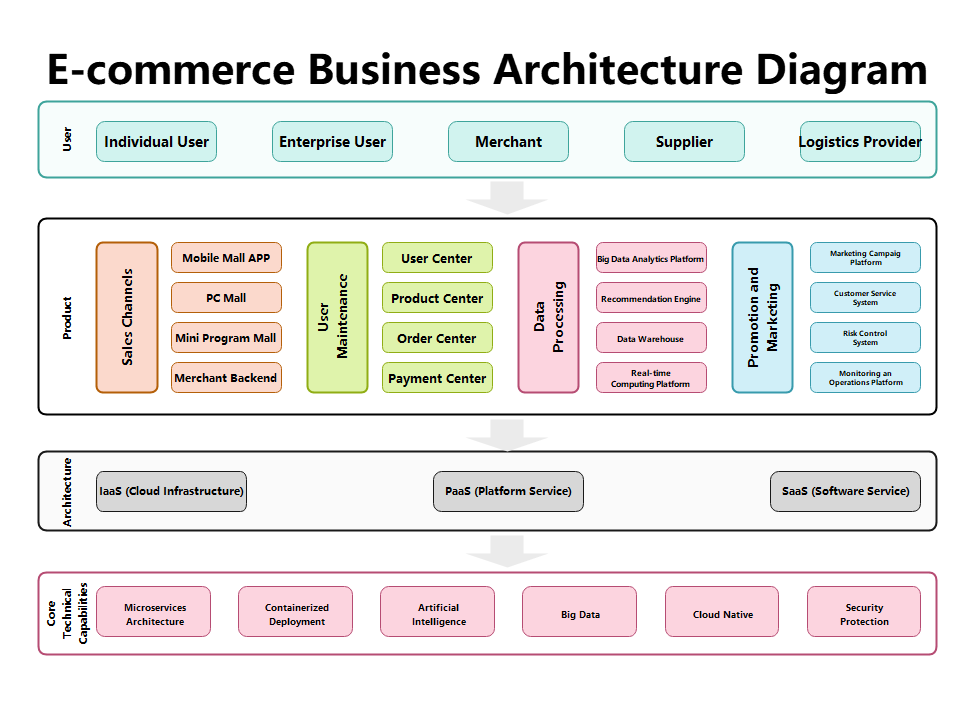 This diagram illustrates the architecture of an e-commerce platform, showcasing user roles, sales channels, data processing, and underlying infrastructure.