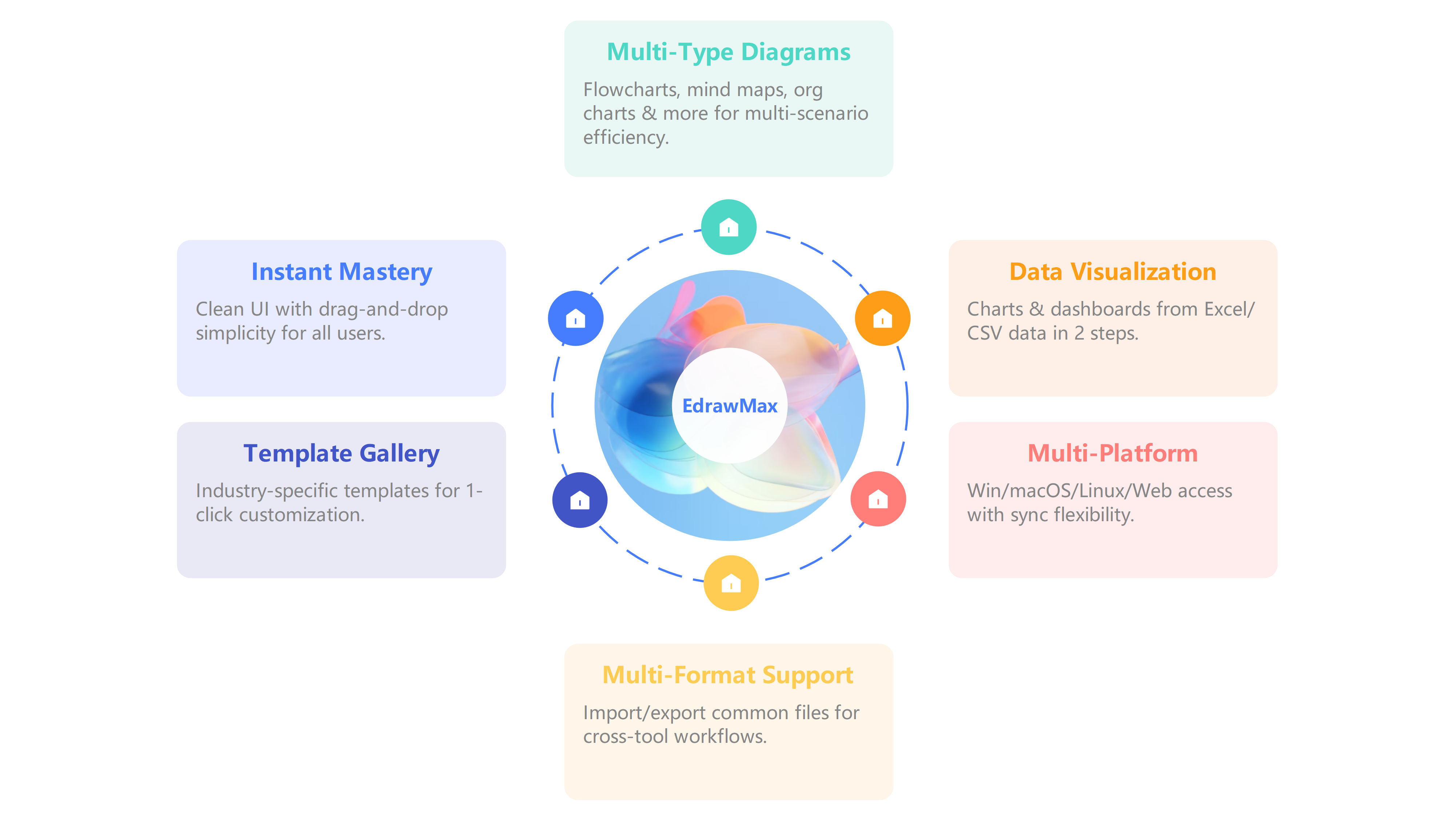 Explore EdrawMax's features: instant mastery, data visualization, templates, multi-platform, diagrams, and format support to enhance your diagramming experience.