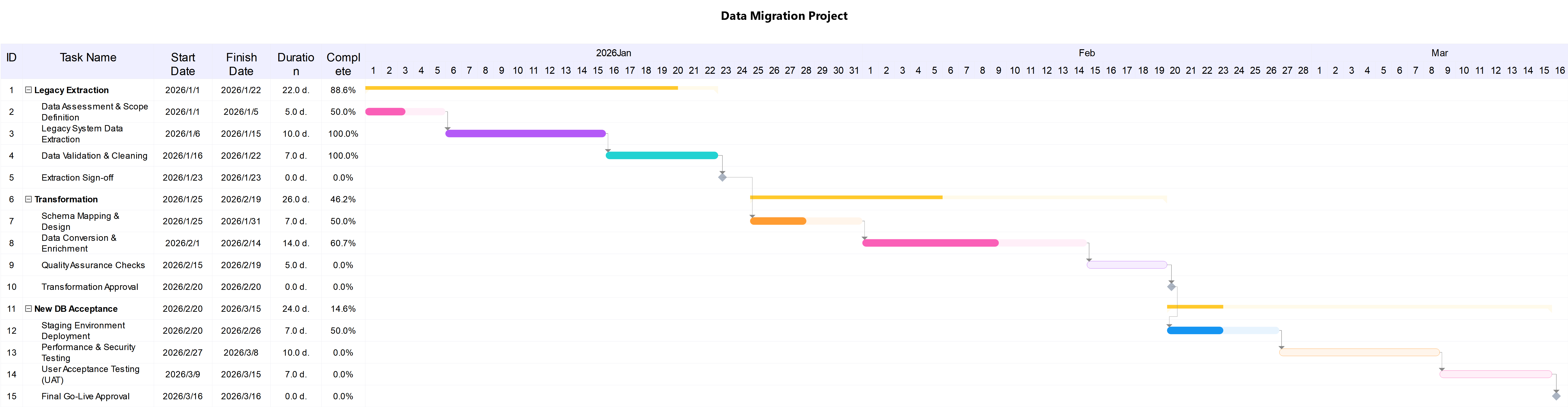 This Gantt chart outlines key project tasks, start/end dates, duration, and completion status from January to March 2026, visualizing the project's overall timeline.