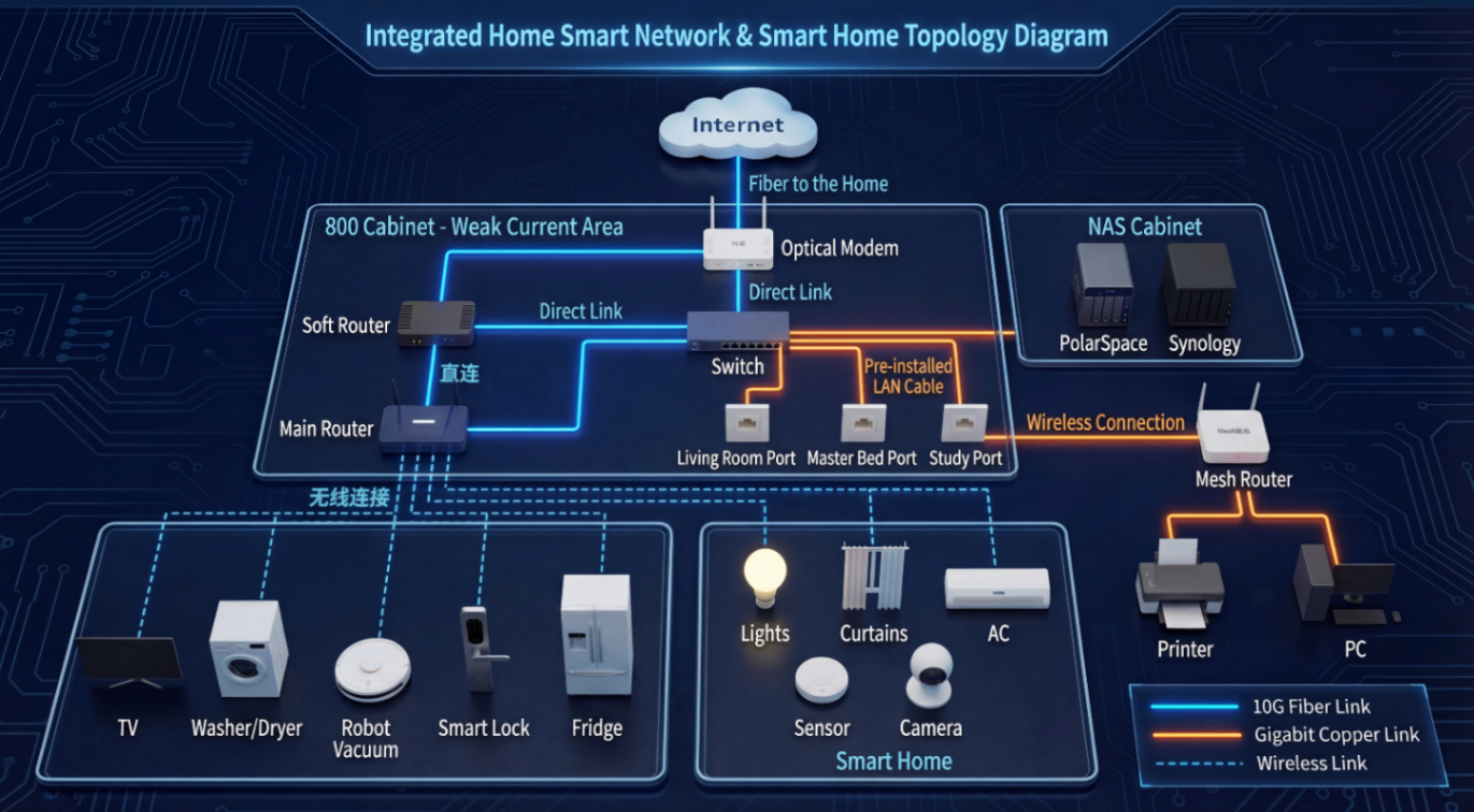 A network diagram showing the connections between devices in a smart home setup, including routers, switches, NAS, and smart home appliances.